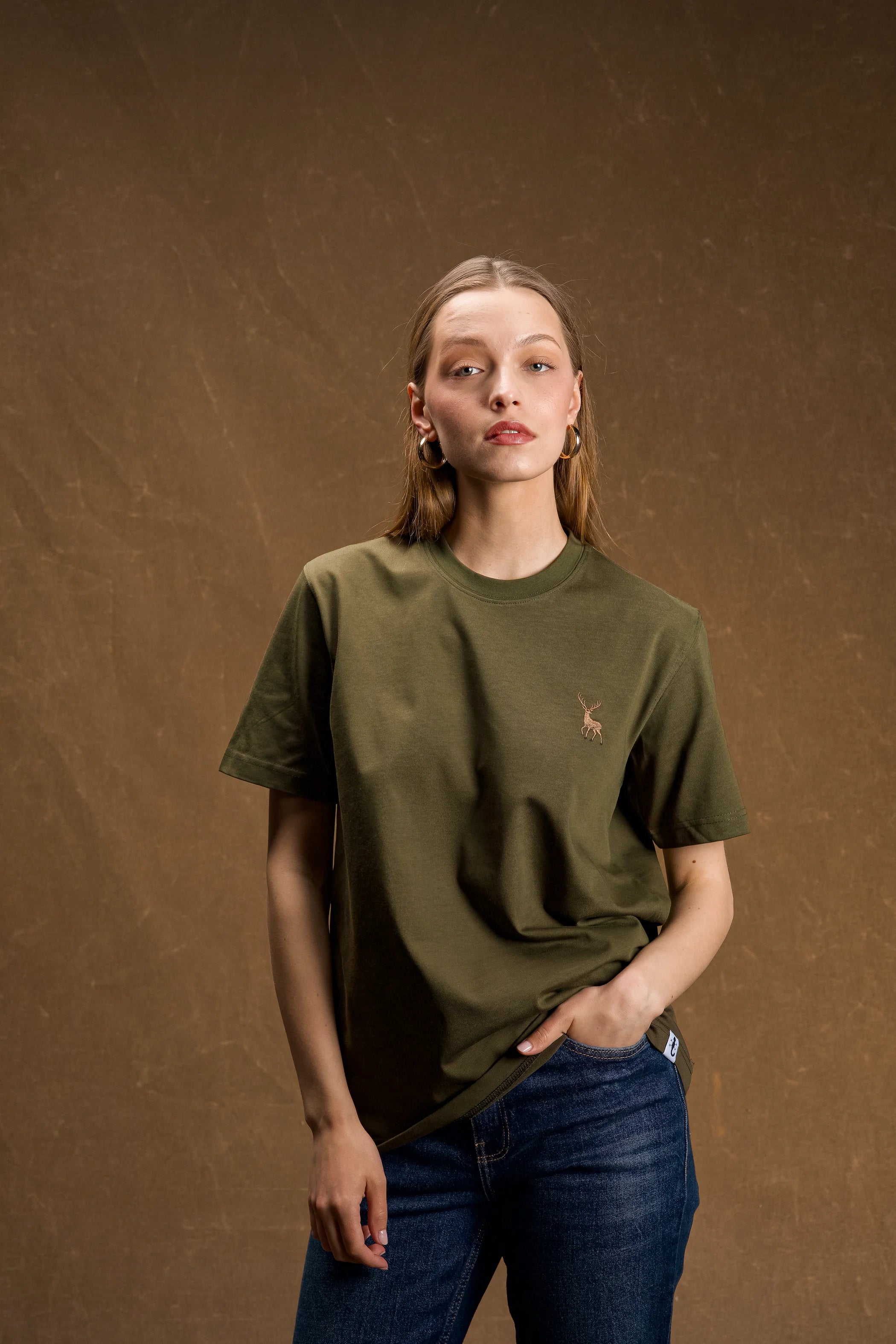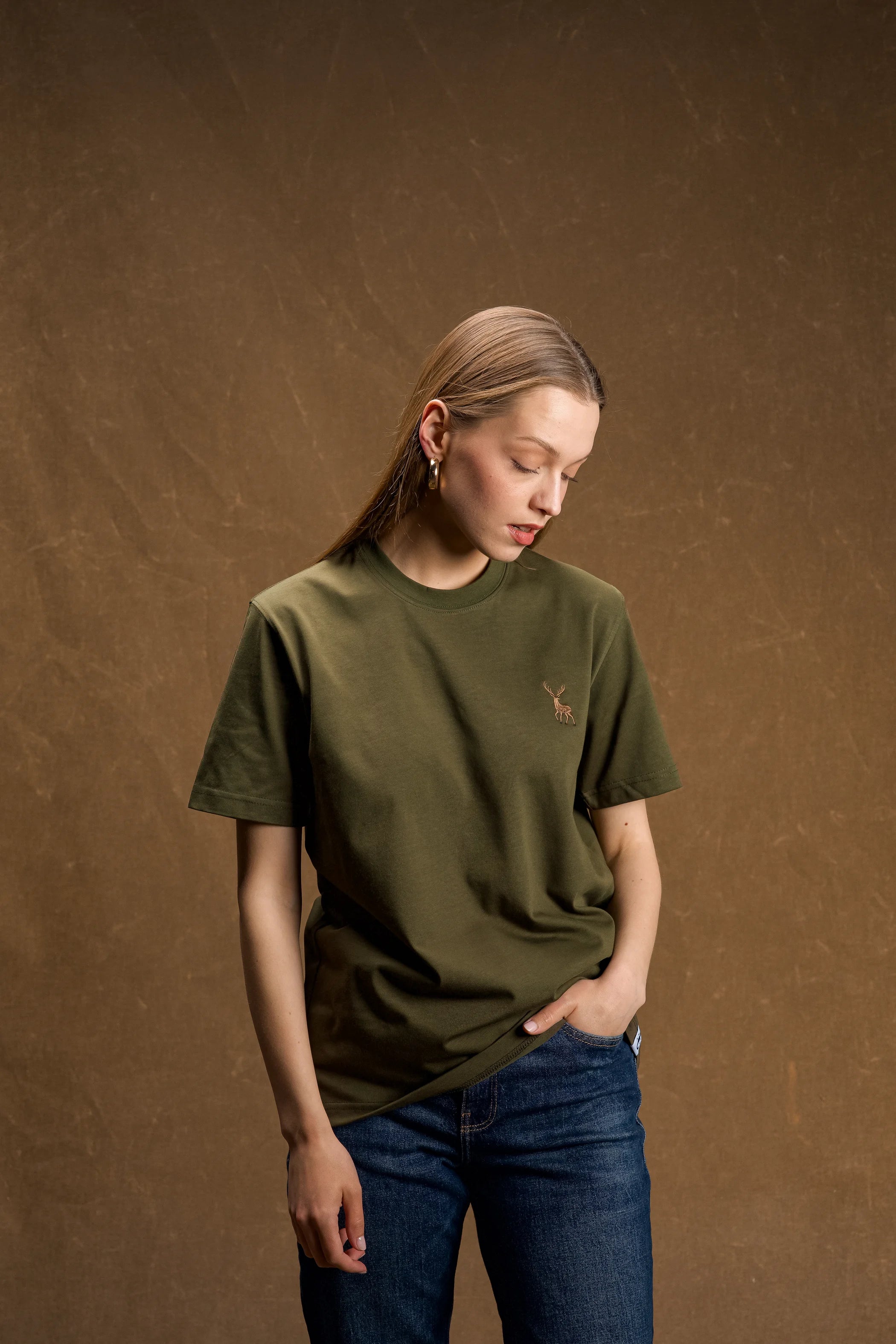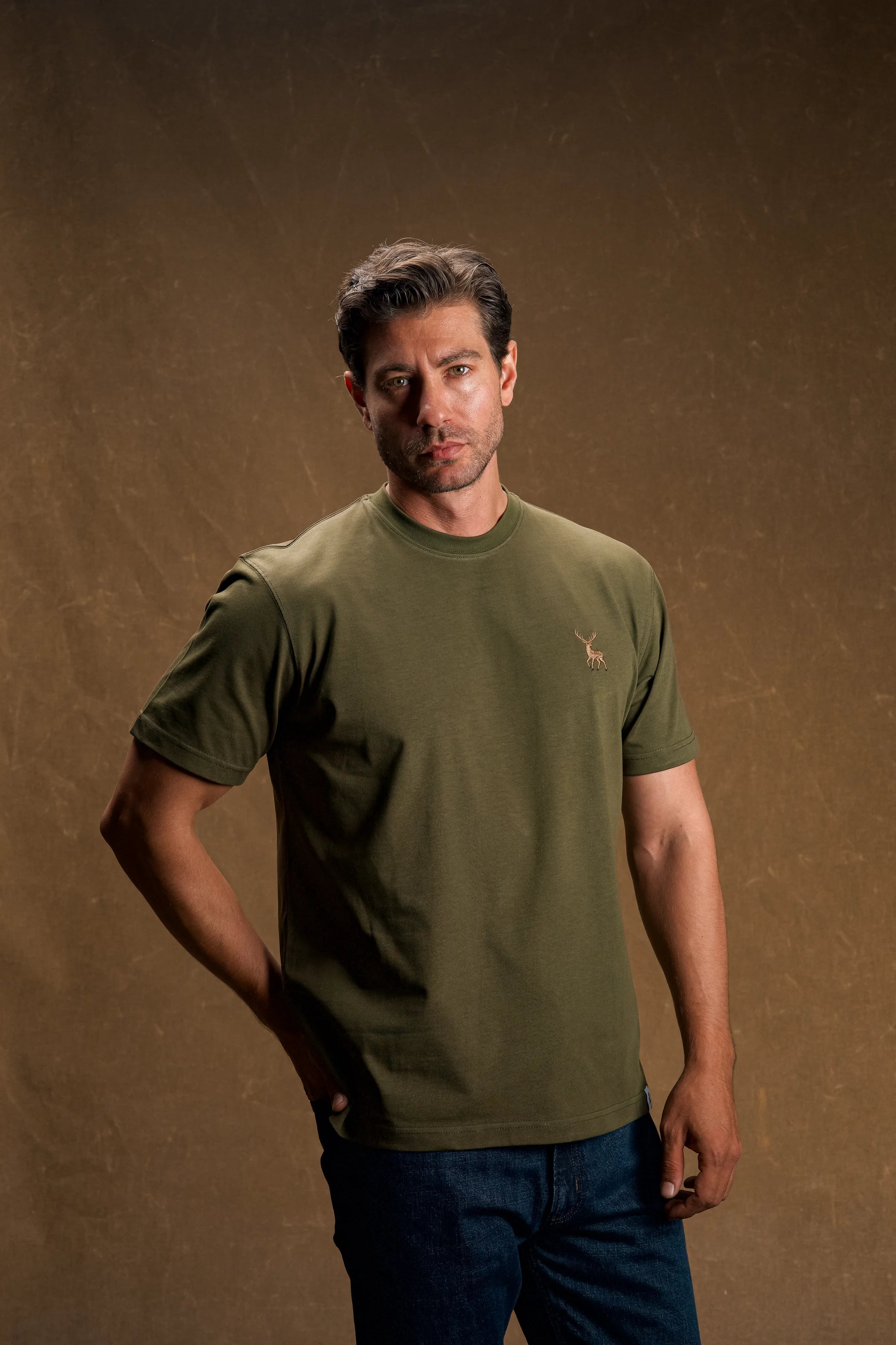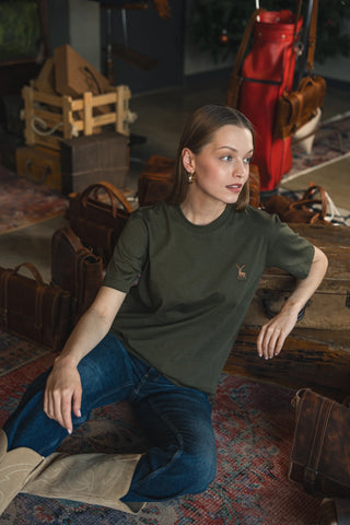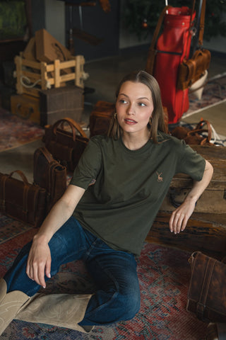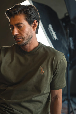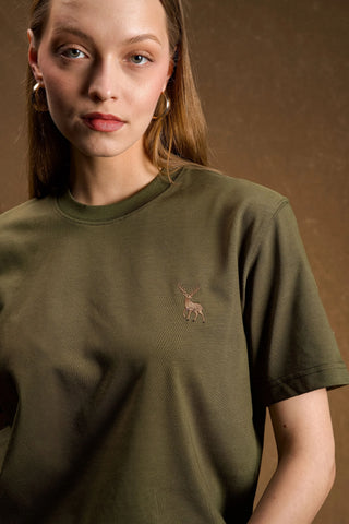 Geyik Nakışlı Haki Yeşil T-Shirt